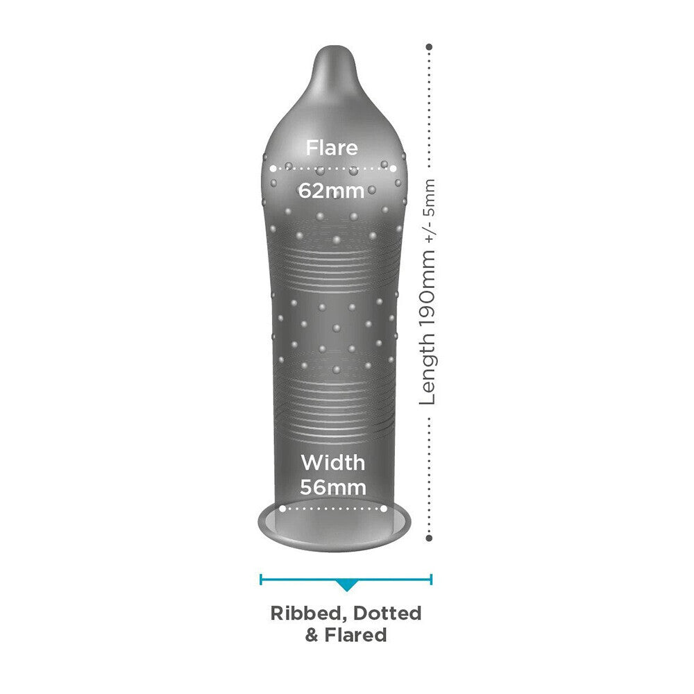 EXS Ribbed and Dotted are a 56mm width with a comfy flared teat. The Ribbed and Dotted are great for extra stimulation for your partner. Vegan-approved and Cruelty-Free. EXS are vegan approved. EXS take great pride in being cruelty-free with no animal testing whatsoever. EXS standards have been awarded by the Vegan Society and animal rights organisation, People for the Ethical Treatment of Animals, PETA. Quality Testing EXS factories as well as the British Standards Institute, BSI, both test our Condoms. Our EXS condoms have a number of tests performed on them including, each condom being electronically tested for holes, and samples being burst pressure tested for strength. The quality of the latex we use for our condoms and the vigorous testing we perform means we can be confident that EXS condoms are amongst the best quality condoms in the world. WIDTH 56 mm THICKNESS 0.072mm LENGTH 193 mm Ribbed and dotted, natural latex, flared, teat ended, and silicone lubricated condom.